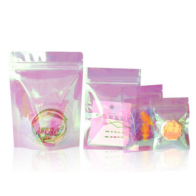 Gıda, şeker, aksesuarlar paketlemek için yeniden kilitlenebilir fermuarlı özel gökkuşağı holografik pembe renkli ayağa kalkan çantalar,